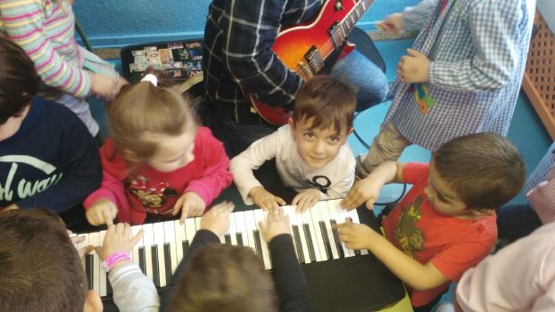 Los alumnos de Ed. Infantil de Cuatro Años tuvieron la oportunidad de participar en un taller de música, dentro del propio aula, en el que, con la ayuda inestimable del padre de uno de los alumnos y algunos compañeros de éste, pudieron trabajar sobre distintos tipos también de instrumentos y su clasificación, distinguir entre sonidos graves y agudos, experimentar con los instrumentos reunidos allí tales como guitarras, tambores, órganos, y trompetas, toda una clase magistral que hizo las delicias de la chavalería.