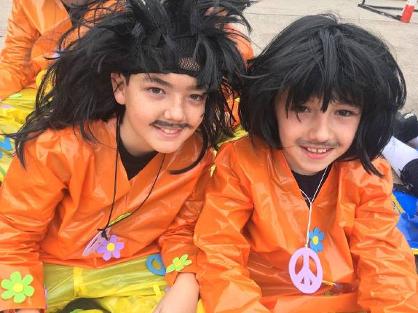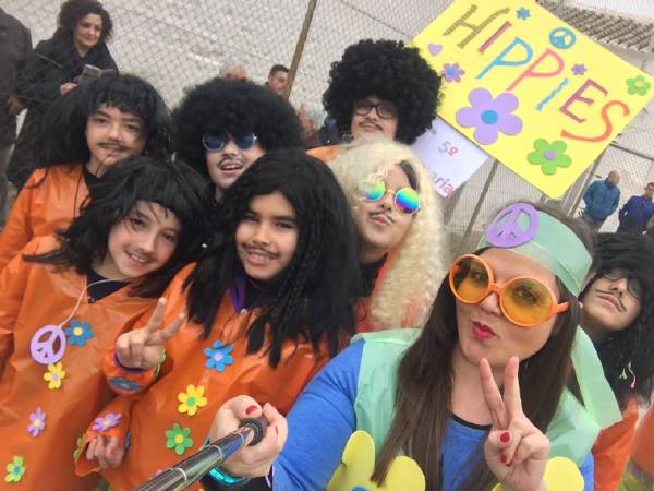 ¡Paz y Amor!, celebraban los chicos y chicas de Quinto de Ed. Primaria abordando la música a través de la época de los «hippys», una fiesta de ideales, libertad y colorismo sin precedentes y que lleno de «power flowers» el desfile carnavalero del Infante. Melenas al viento y mucha simbología para cambiar el Mundo y con melodías inolvidables que llevaron de la mano su paso por las calles de Daimiel.